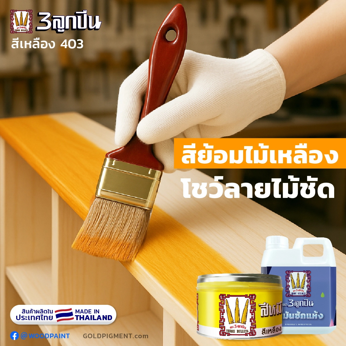 —สีหมึกย้อมไม้ สีเหลือง “3ลูกปืน” น้ำหนักสุทธิ 900 กรัม